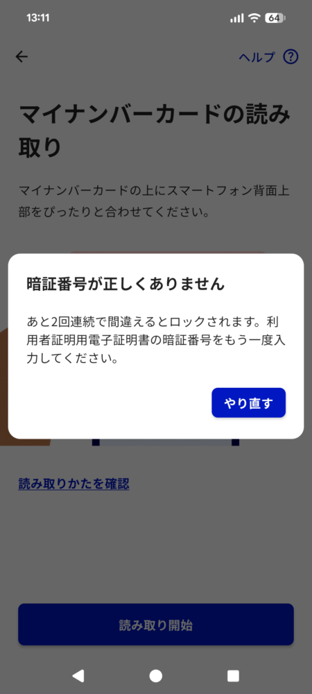 もし暗証番号を間違えている場合は、読み取りの後にこういう画面が出ます。