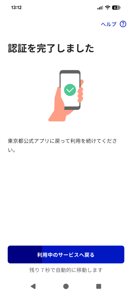 11. 認証完了の画面になったら東京都アプリに戻るまで待つ