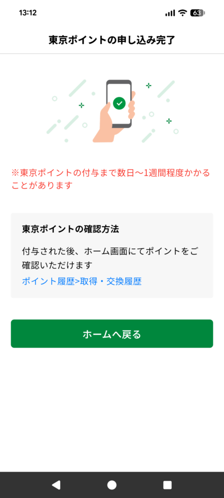 13. 東京ポイントの申し込み完了の画面になったらOK!
