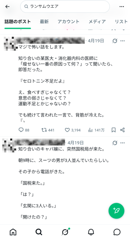 ランサムウェアとは関係のない、セロトニン不足やキャバ嬢のポストが出てきました。